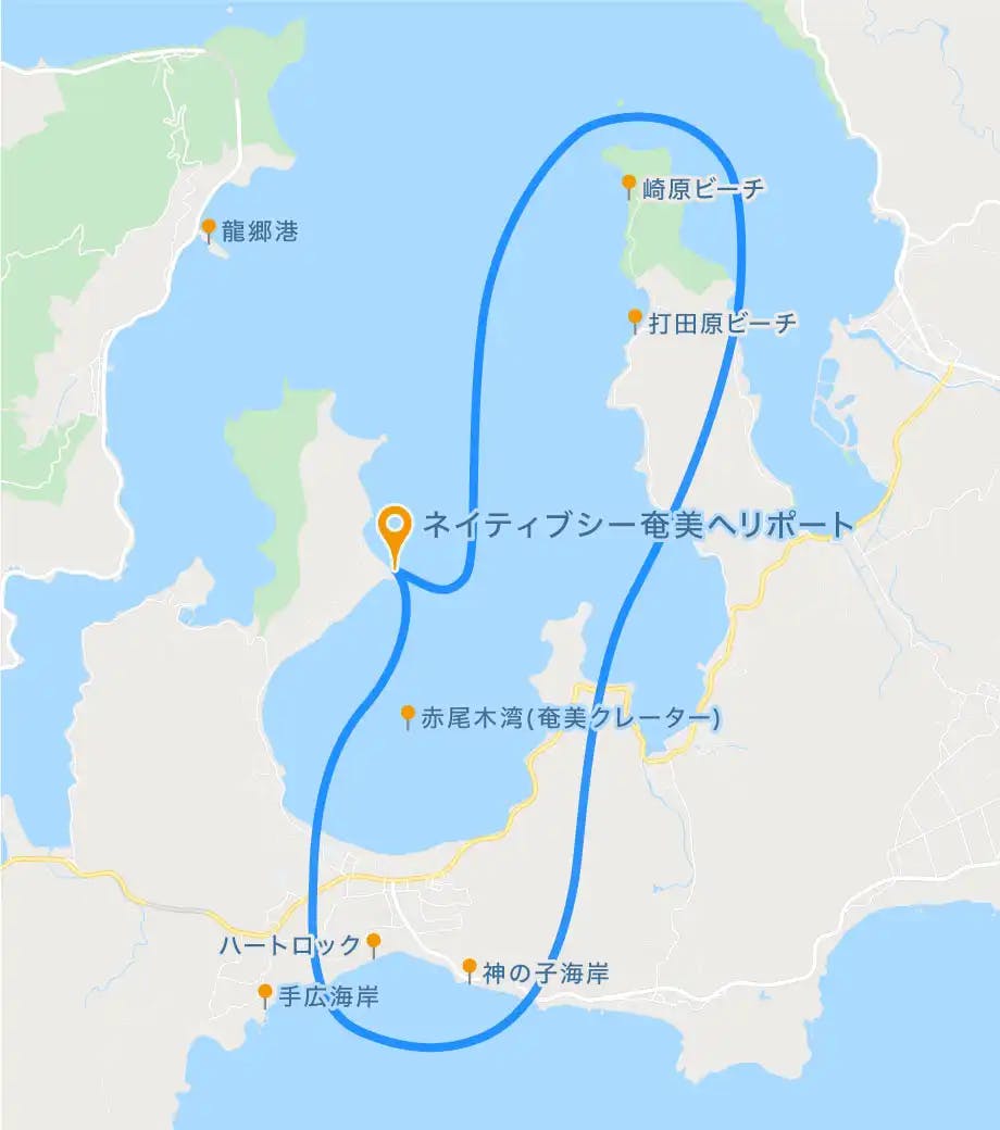 赤尾木湾、喜瀬、龍郷、打田原ビーチ、崎原ビーチを眺むヘリコプター遊覧。旅行中のサプライズ、奄美大島観光におすすめ。忘れられない奄美観光を楽しみませんか?