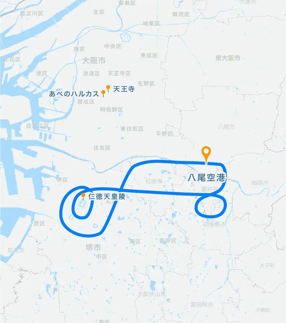 古代・大阪を小型飛行機で遊覧するプランです。仁徳天皇が眠る大仙陵古墳や百舌鳥古墳群、塚廻古墳など各古墳を360度方位から観察!南港・コスモタワー、アベノハルカスなど大阪のランドマークにも注目。関西観光や自由研究にも。機体は話題のセスナをセレクトしました。