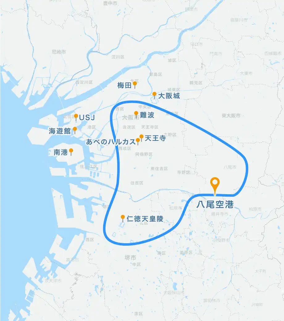 八尾空港, あべのハルカス, 天王寺, 難波, 大阪城, 梅田, ユニバーサル・スタジオ・ジャパン, 海遊館, 南港