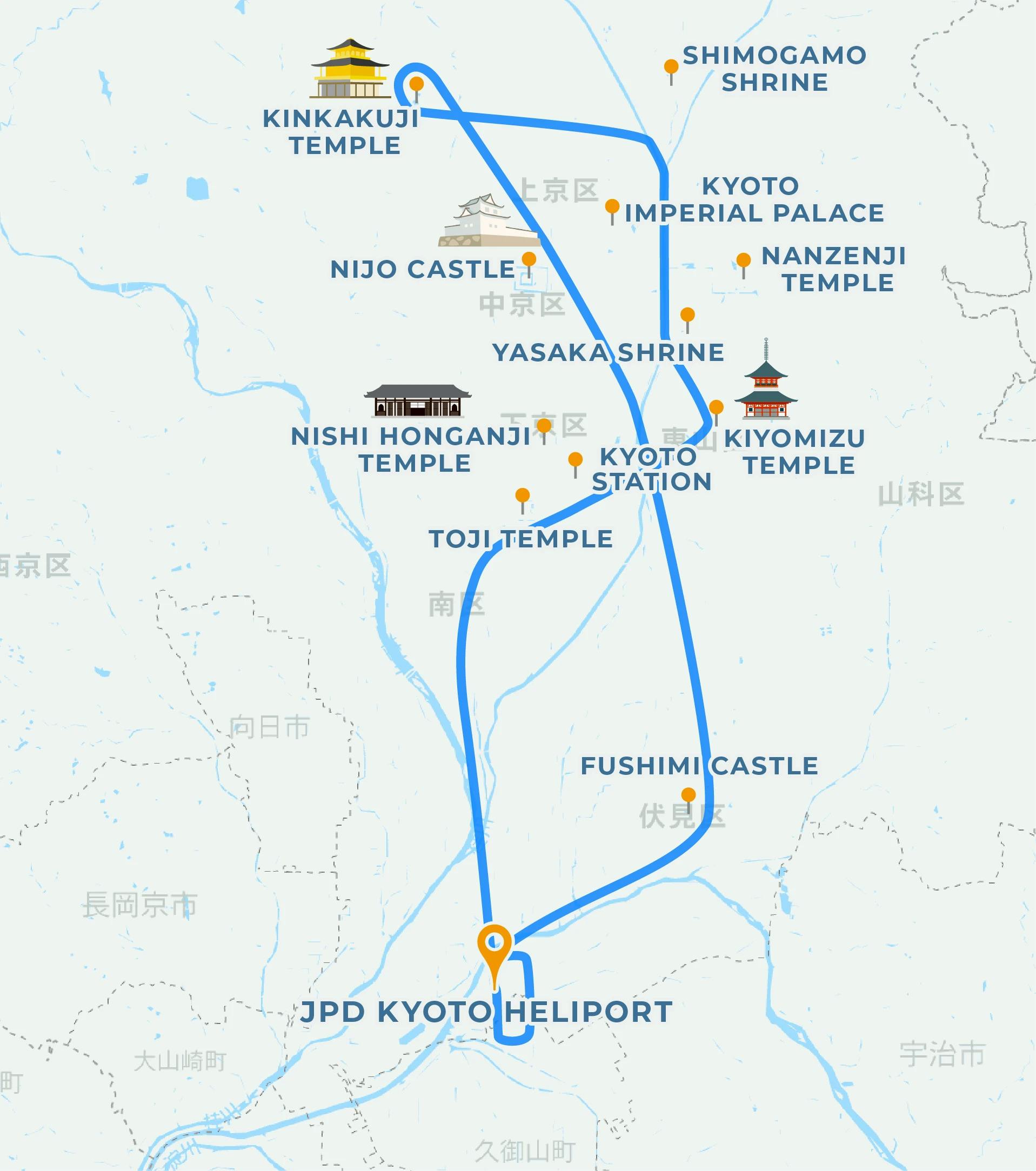 Enjoy a helicopter tour around the famous shrines and temples in the vicinity of Kyoto Station and Kinkaku-ji. This plan not only covers the Kyoto Station area, but also major sightseeing spots such as Yasaka Shrine, Nanzen-ji, and Shimogamo Shrine. Not only for sightseeing in Kyoto, it is also popular for proposals and anniversary dates.