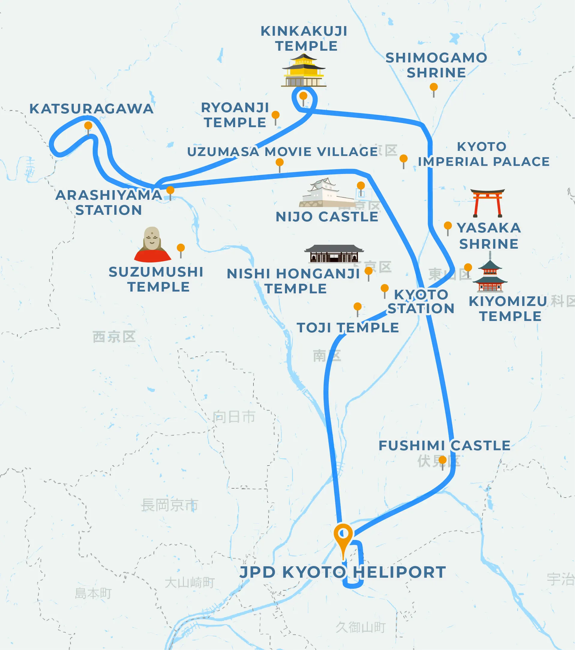A popular plan where you can fully enjoy Kyoto's shrines and temples from the sky, extending all the way to Arashiyama. You can enjoy a leisurely view of the Kyoto skyline from a chartered helicopter. Starting from 35,000 yen per person, you can sightsee Kyoto from the sky! This popular plan allows you to enjoy Kyoto in every season, with cherry blossoms in spring and colorful leaves in autumn.