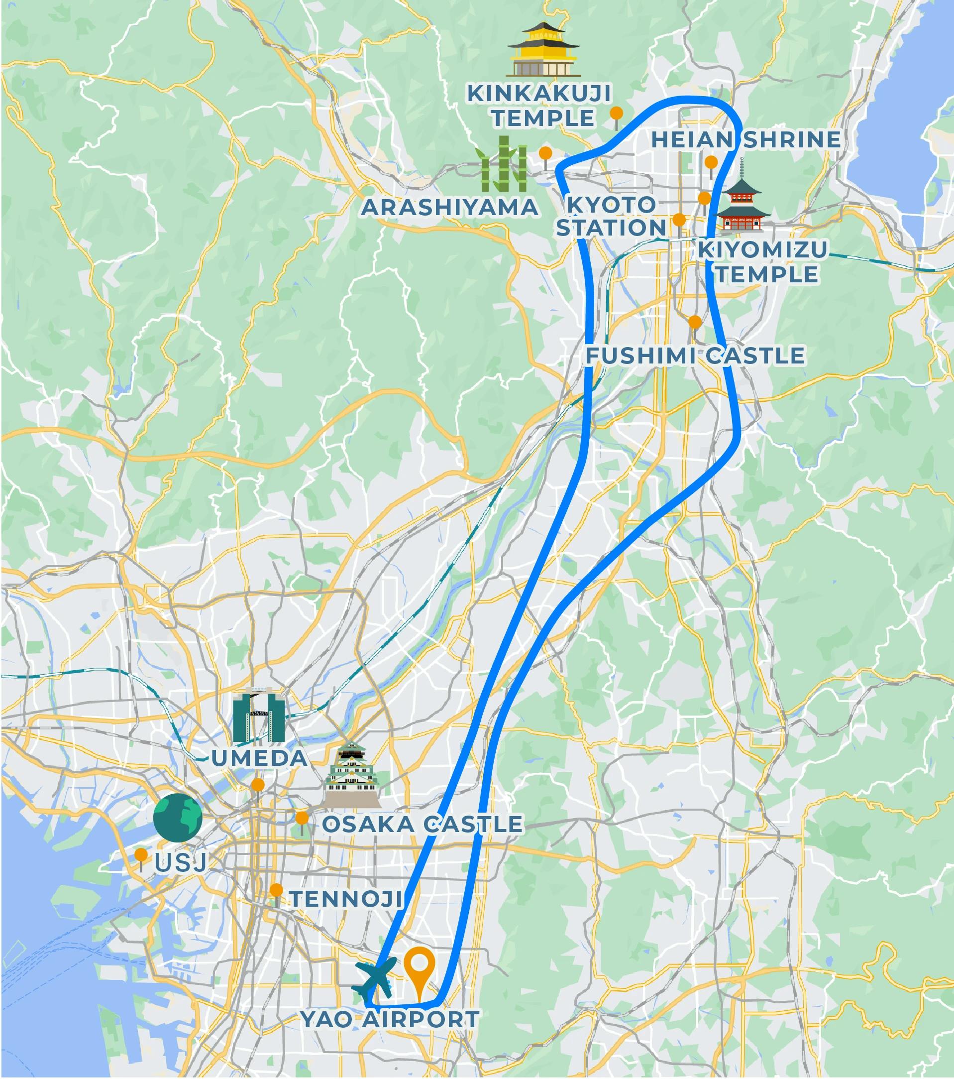 Kyoto Imperial Palace, Nijo castle, Yasaka Shrine, Kiyomizu Temple, Higashi Honganji Temple, Nishi Honganji Temple, Kyoto Station, Toji Temple, Fushimi castle, Nanzenji Temple, Shimogamo Shrine, Kinkakuji Temple, Ryoanji Temple, Heian Jingu Shrine, Arashiyama