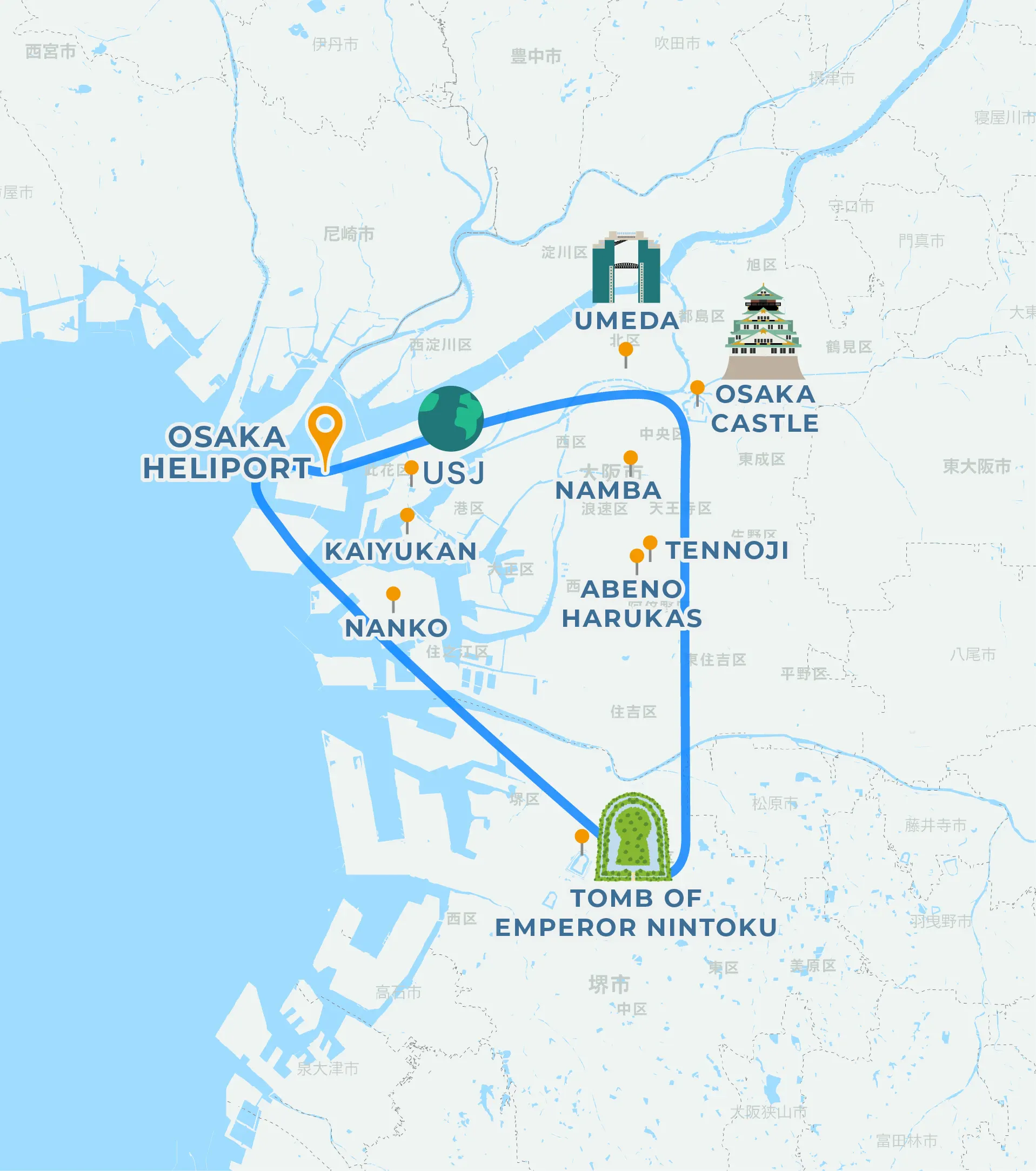 A gorgeous 20-minute plan that includes Osaka Castle, Abeno Harukas in the background, and the Daisenryo Burial Mound, which is registered as a World Heritage Site. Enjoy an aerial trip with a vivid contrast between history and modernity.