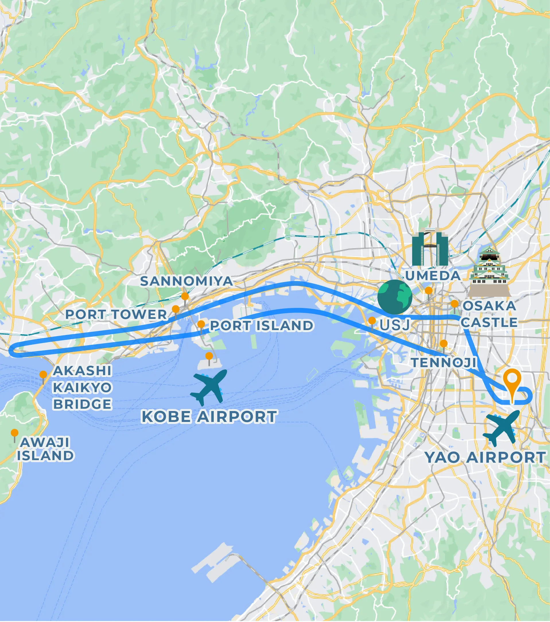 Helicopter cruising in the three cities of Osaka, Kobe, and Akashi in 50 minutes.After sightseeing in the sky over Osaka and Kobe, move to Kobe. We will cover all the must-see spots in Kansai, such as Akashi Kaikyo Bridge and Sannomiya.