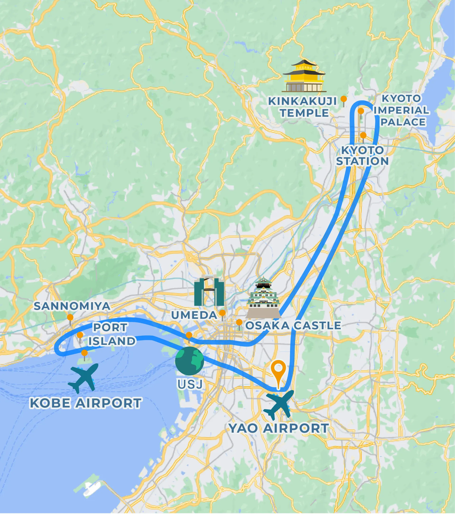 Kyoto, Tennoji, Namba, Tsūtenkaku, USJ, Sannomiya, Harborland, Mt. Rokko, Port Island