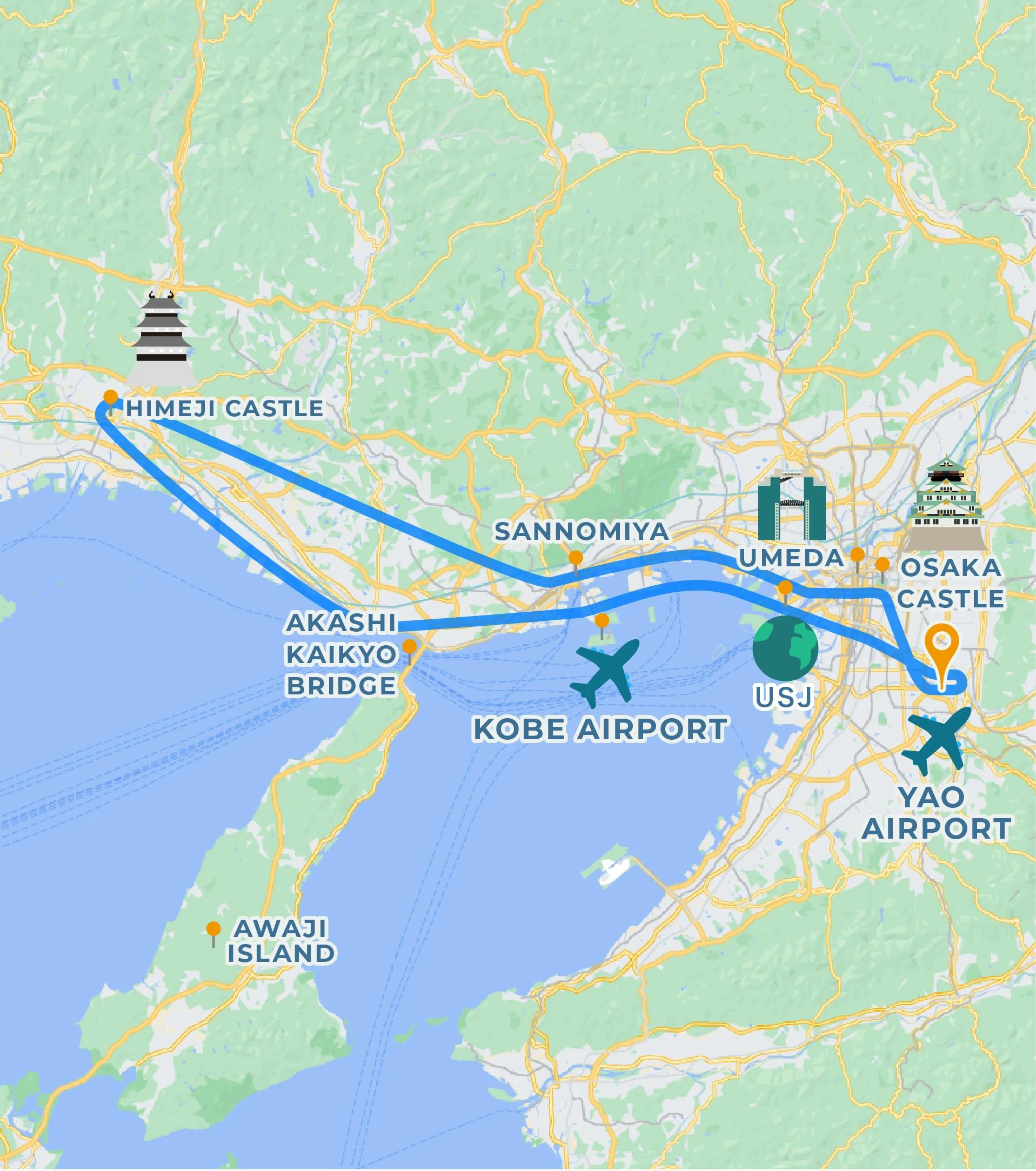 Himeji castle, Akashi-Kaikyo Bridge, Tennoji, Namba, Tsūtenkaku, USJ, Sannomiya, Harborland, Mt. Rokko, Port Island