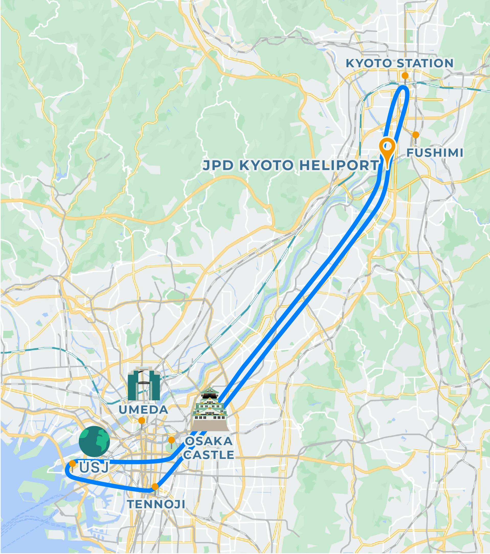 Departing from JPD Kyoto Heliport, you can see the night view of Kyoto such as Kyoto Station and Kyoto Tower. After that, move to Osaka and enjoy the night view unique to Osaka such as USJ and Tsutenkaku. A gorgeous night excursion around the two cities is recommended not only for sightseeing but also for dates and celebrations.