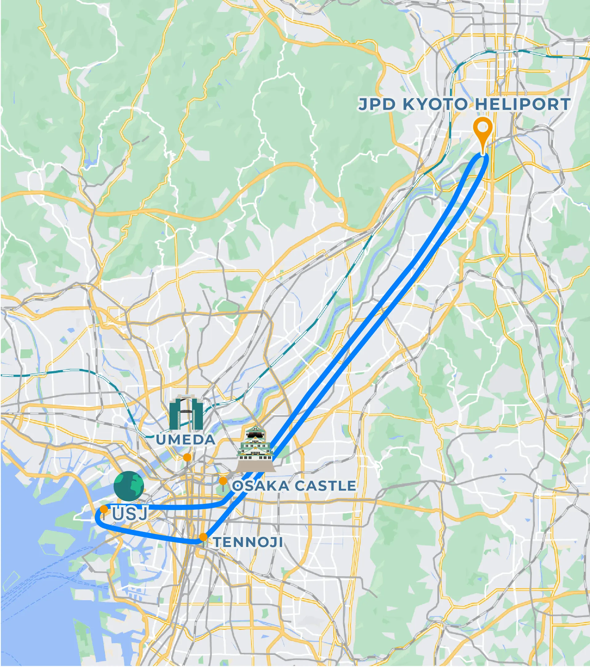 From the JPD Kyoto heliport to Osaka, you can enjoy the brilliant night view of Osaka such as USJ and Tsutenkaku from 600m above the sky. The beautifully lit up scenery while gazing at the night view is perfect for an anniversary date! Would you like to share a wonderful moment and have a special and memorable time?