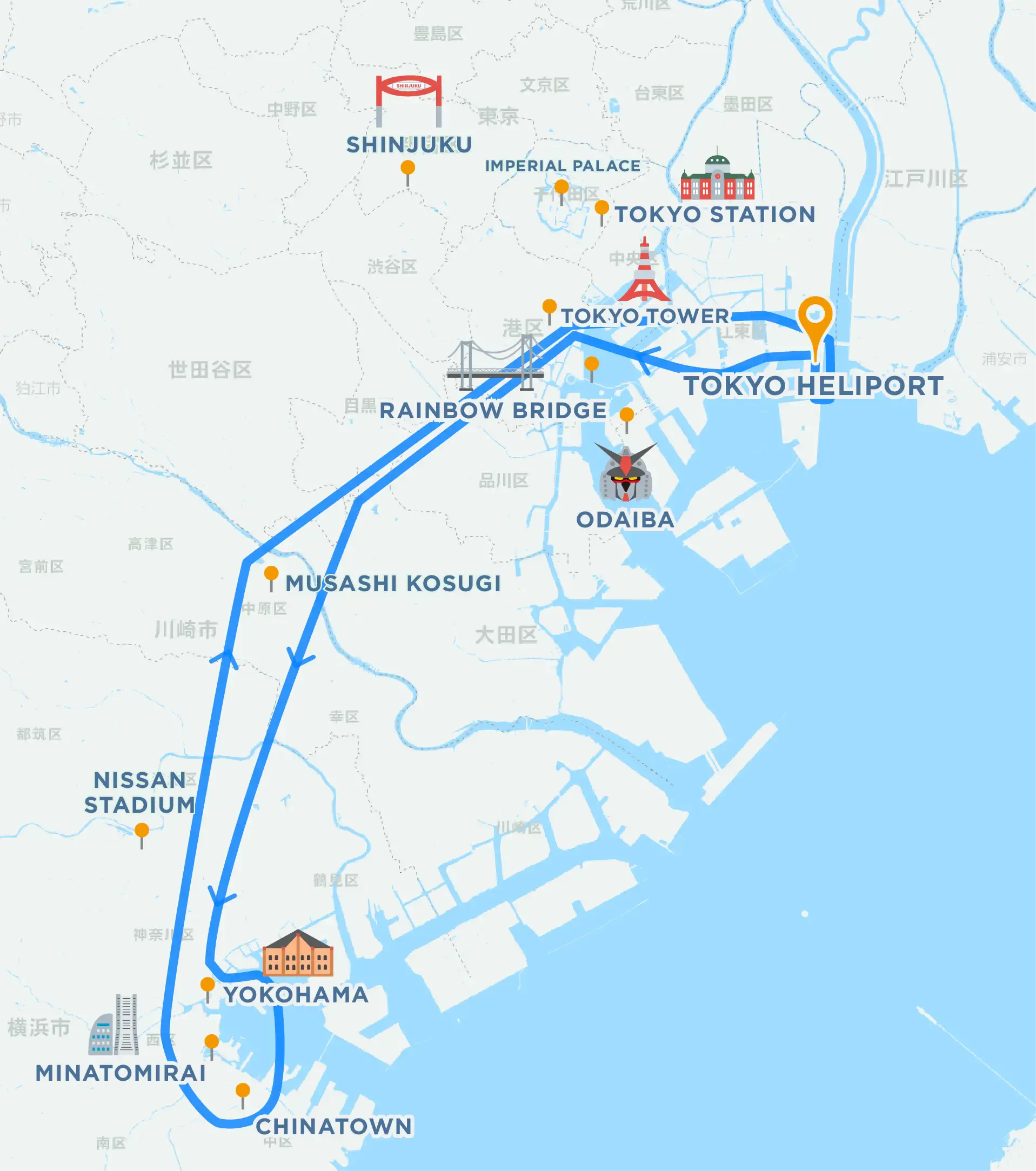 Explore further West of Tokyo, and the City of Yokohama with this helicopter tour package. The beautiful, multicultural city of Yokohama is even more breathtaking from above. Fly past the Tokyo Tower, Rainbow Bridge, and Tokyo Bay. Upon arrival in Yokohama, witness the beauty of the city of Yokohama, and the famous Chinatown, and the world renowned port of Yokohama.