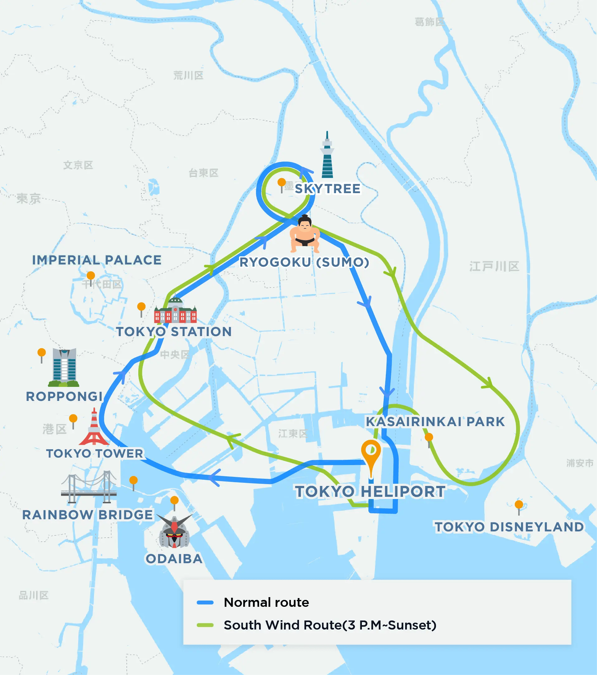 Flight routes may vary based on the wind direction on the day of your flight to avoid flight paths near Haneda Airport.