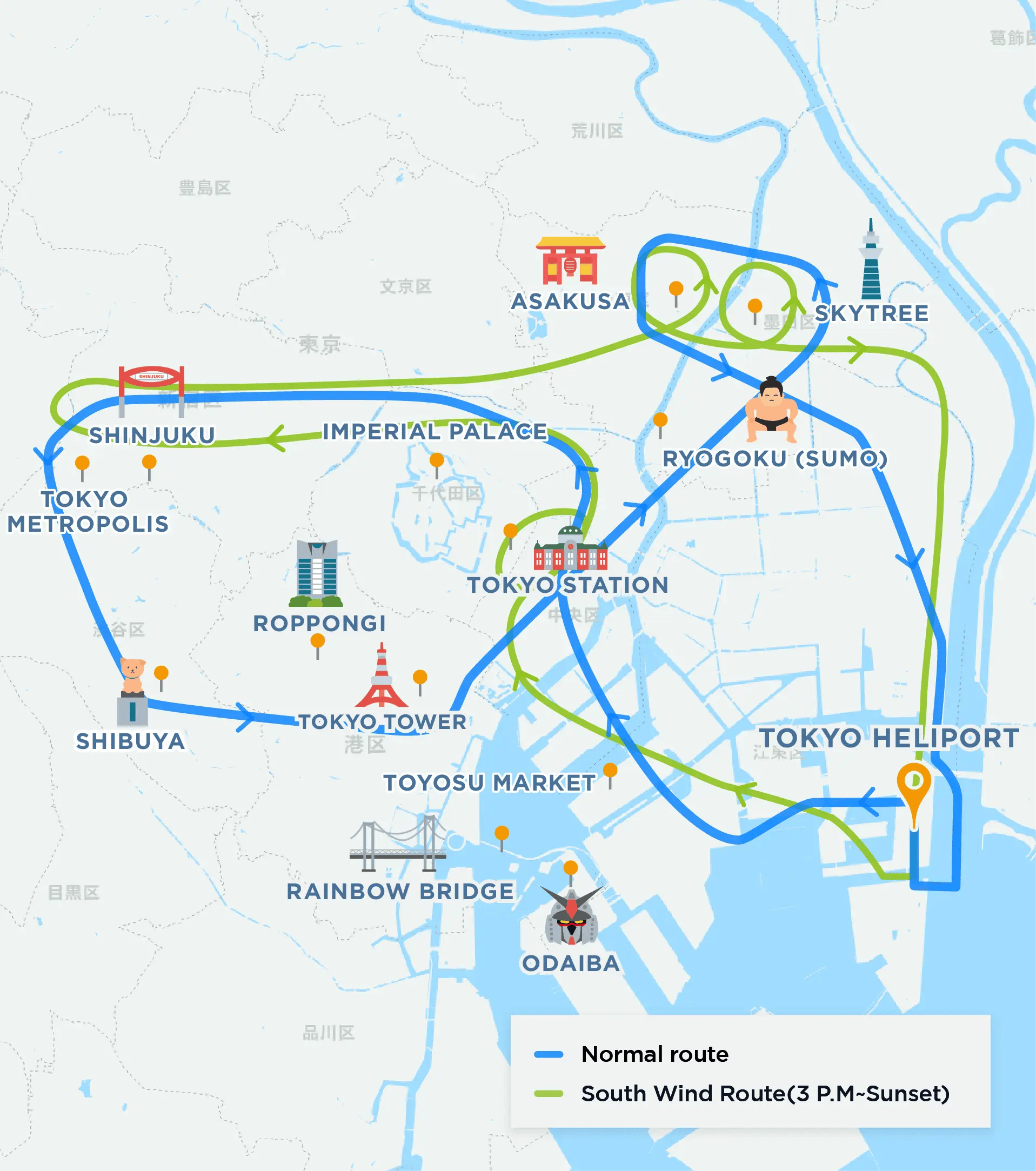 Rainbow Bridge, Kachidoki Bridge, Tokyo Station, Akihabara, Tokyo Stadium, Imperial Palace, Shinjuku, Meiji Jingu Shrine, Shibuya, Haneda Airport, Roppongi Hils, Tokyo Tower, Ryōgoku Kokugikan(for Sumo), Skytree, Sensoji Temple(in Asakusa)