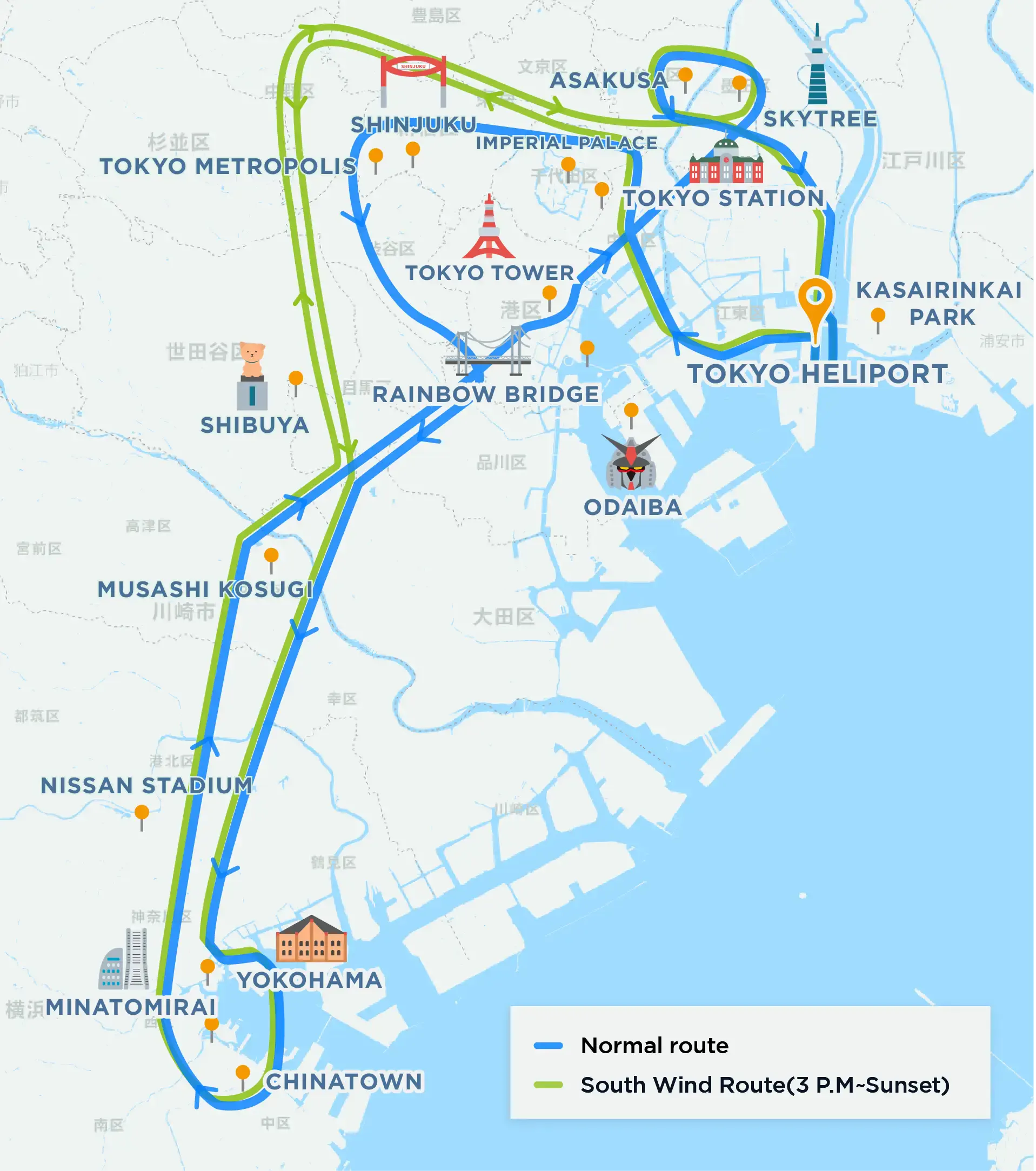Rainbow Bridge, Kachidoki Bridge, Yokohama Landmark Tower, Yokohama Chinatown, Yamashita Park(Hikawamaru), Tokyo Station, Akihabara, Tokyo Stadium, Imperial Palace, Shinjuku, Meiji Jingu Shrine, Shibuya, Haneda Airport, Roppongi Hils, Tokyo Tower, Ryōgoku Kokugikan(for Sumo), Skytree, Sensoji Temple(in Asakusa)