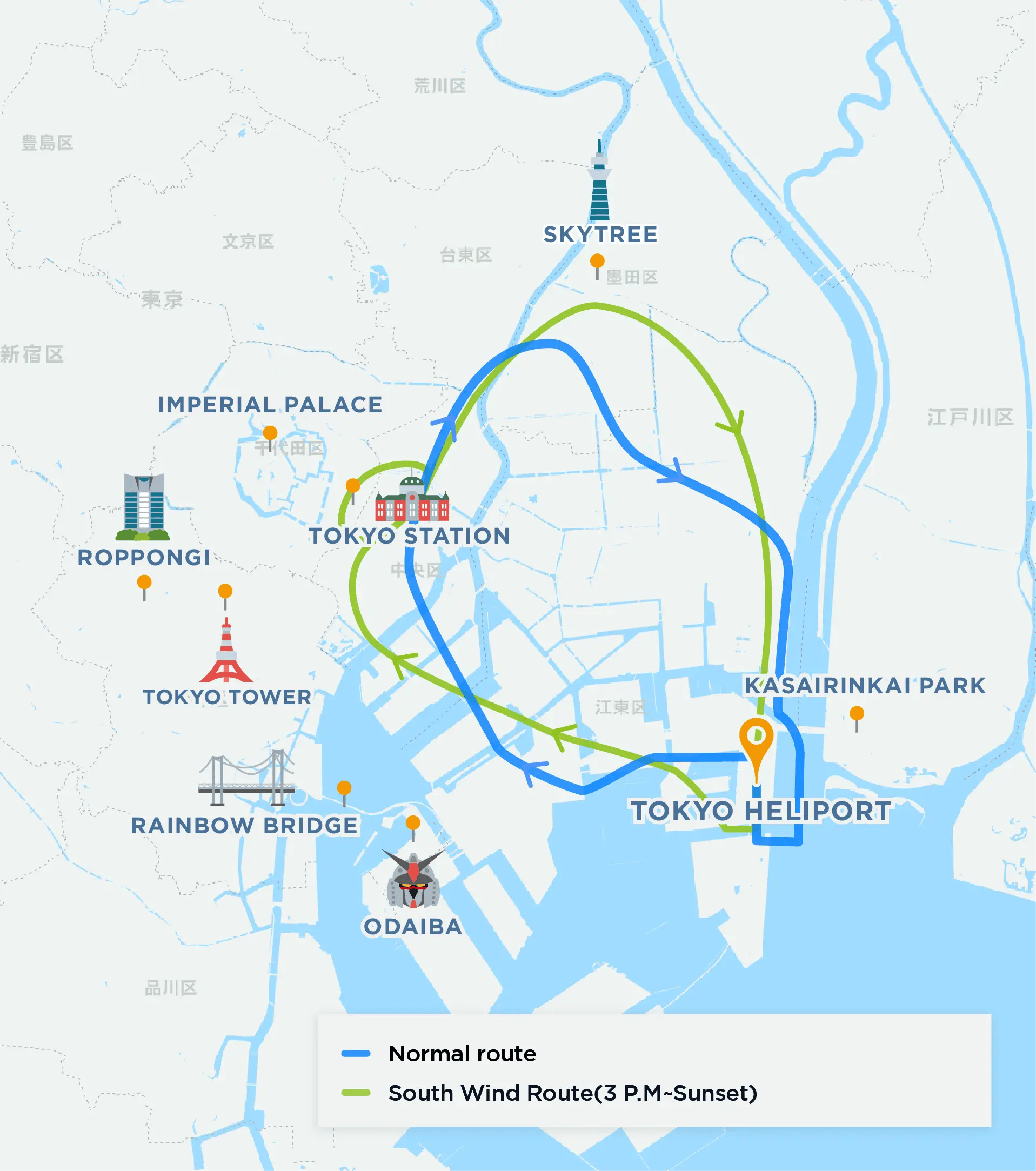 Rainbow Bridge, Kachidoki Bridge, Tokyo Station, Akihabara, Tokyo Stadium, Imperial Palace, Shinjuku, Meiji Jingu Shrine, Shibuya, Haneda Airport, Roppongi Hils, Tokyo Tower, Ryōgoku Kokugikan(for Sumo), Skytree, Sensoji Temple(in Asakusa)