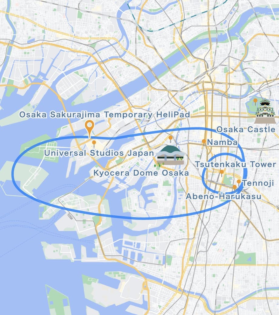 Departing from the Osaka Sakurajima Temporary Helipad, enjoy a night-view helicopter cruising experience over Osaka. This flight tours major spots including Abeno Harukas, Tsutenkaku Tower, the Osaka Bay Area, Namba, and Shinsaibashi. Take in the beautifully illuminated nightscape of Osaka from the sky.