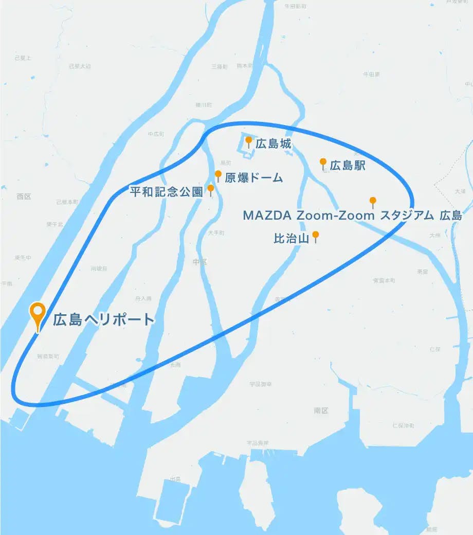 広島市内上空をヘリコプターでクルージング。平和記念公園、MAZDA Zoom-Zoom スタジアム 広島、広島駅、瀬戸内海、広島城などを巡る8分のヘリ遊覧です。少ない予算でも大満足でお得なプランです。