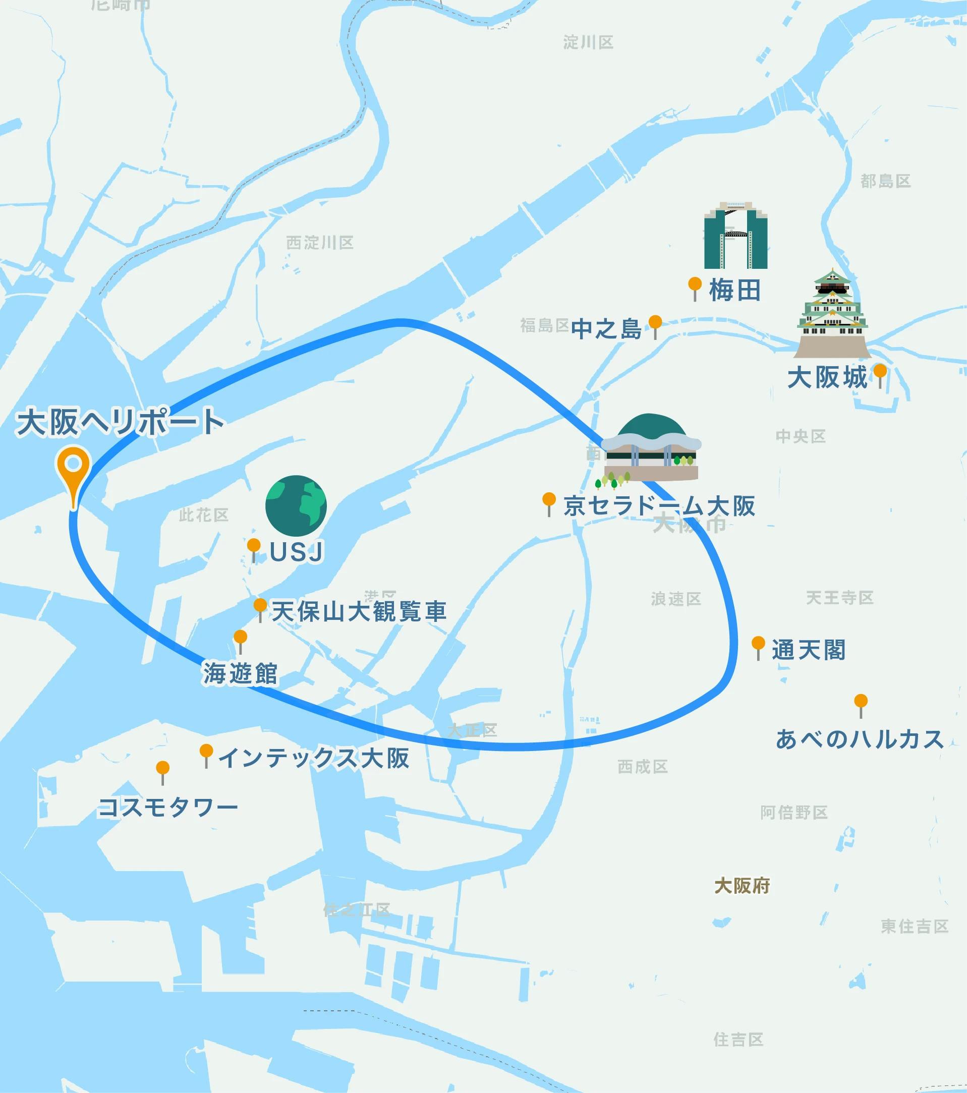 USJ(ユニバーサルスタジオジャパン)や京セラドーム、大阪城など大阪市内の主要な観光シンボルを空から眺めてみませんか?観覧車から眺める景色よりもはるかに高いところから一望していただけます。大阪の観光地を一気に押さえておきたい皆様にオススメのプランです。