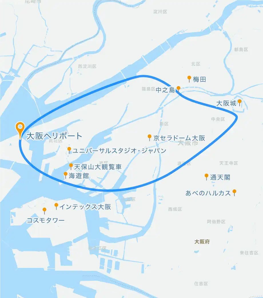 クリスマスフライト限定!大阪ヘリポートを出発して、USJ(ユニバーサルスタジオジャパン)や京セラドーム、大阪城や通天閣などをご覧いただいた後、梅田のビル群、スカイビルタワーなどをご覧いただき、ヘリポートに戻ってきます。大阪の歴史と現代のコントラストを楽しめる人気のコースです。