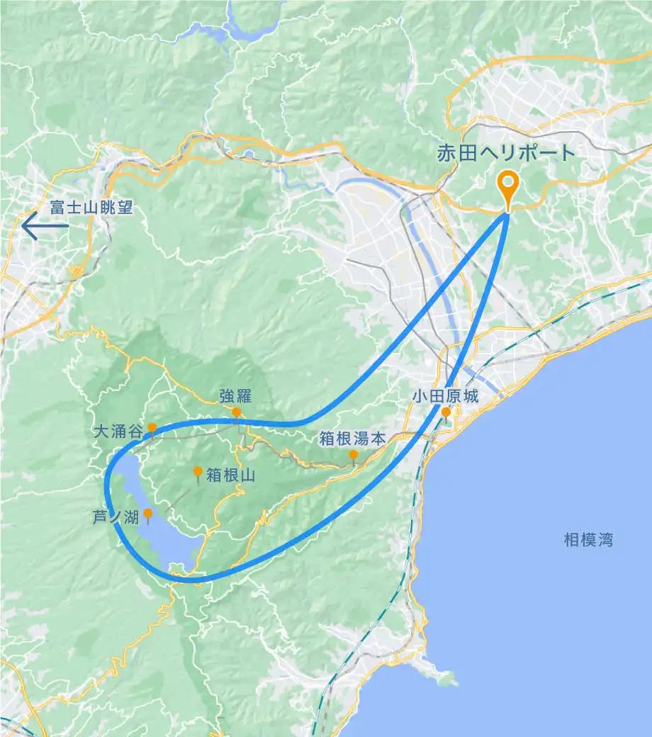 箱根エリアを空からヘリで観光するならAIROS Skyview。箱根をヘリコプターで遊覧できます。芦ノ湖、大涌谷、富士山などの名所を空から一望できる遊覧体験が魅力。箱根エリアのクルージングにおすすめ。