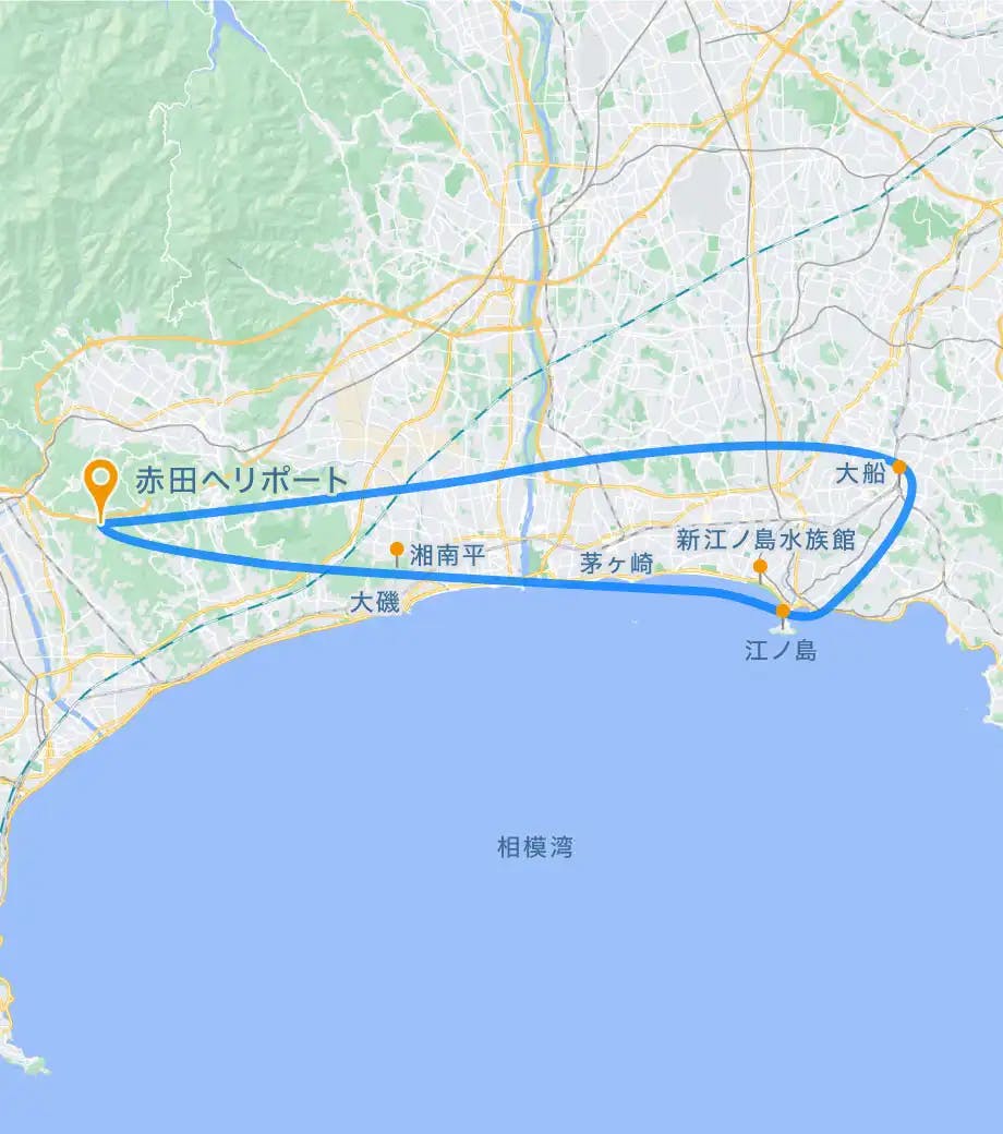 湘南平・江ノ島・鎌倉の夜景を満喫するヘリコプタークルージング!湘南平や江ノ島上空をヘリ遊覧したあと、鎌倉・大船方面へ移動。江の島シーキャンドルや湘南平など、湘南・茅ヶ崎エリアの欠かせないスポットをヘリで遊覧します。