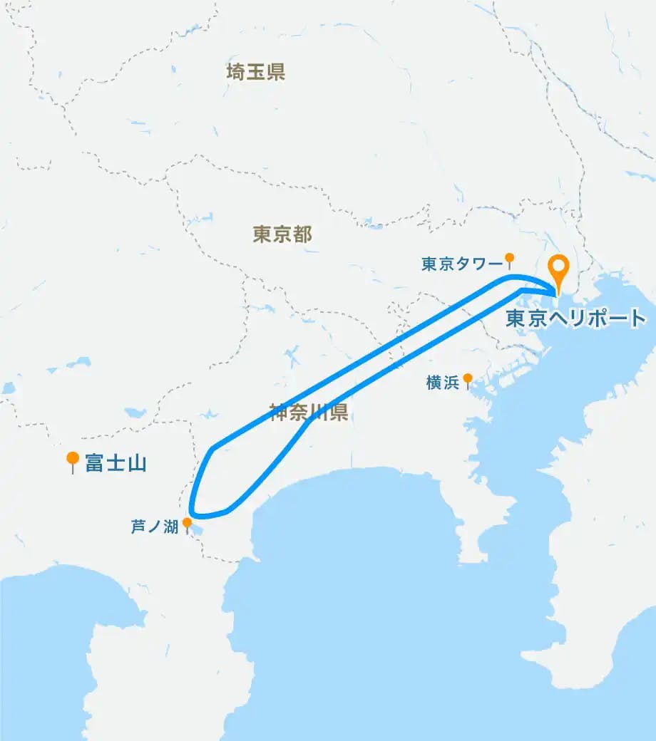 東京(新木場)を離陸し、お台場・多摩川・みなとみらい・箱根芦ノ湖上空を遊覧し、遠くには富士山を臨みます。広くて快適な大型ヘリは、ご家族で観光やデートにもピッタリです。
