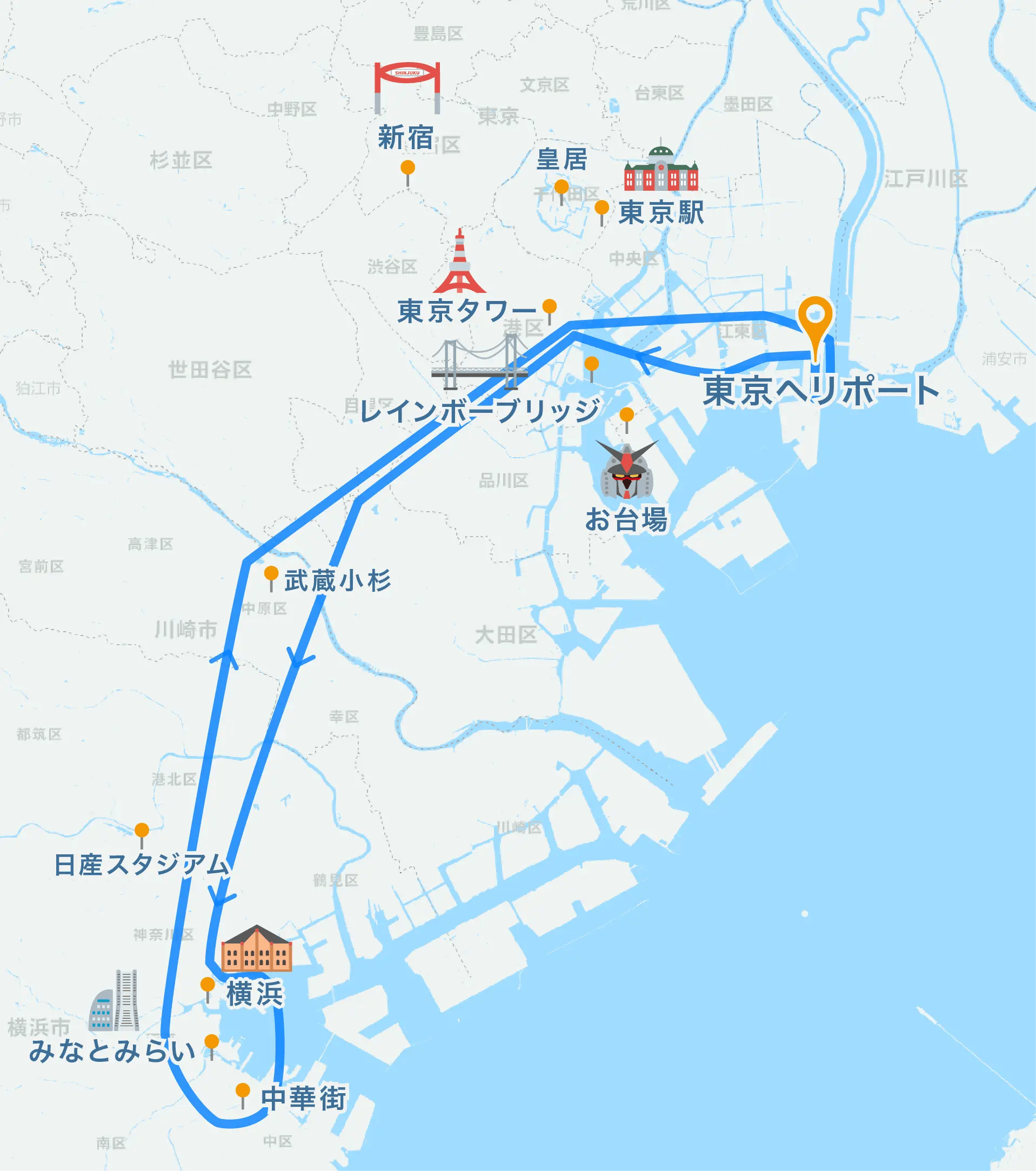 東京湾岸部と横浜の2エリアを楽しめるヘリコプタークルージングプランです。お台場やレインボーブリッジを経て、品川・五反田のオフィス街上空を経由、横浜方面へ移動します。40分間の贅沢なフライトをお楽しみに。