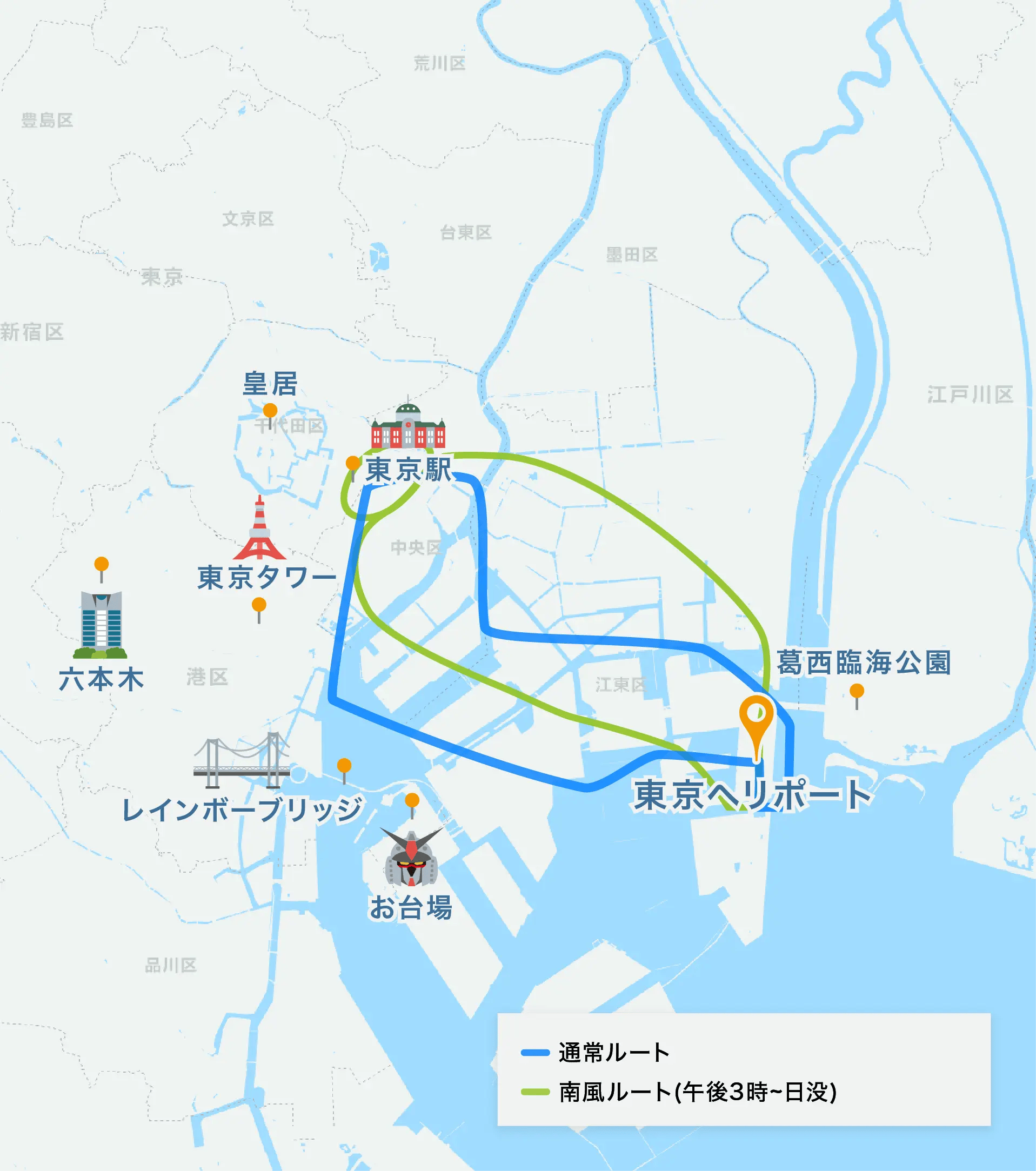 羽田空港の新飛行経路の運用開始に伴い、フライト当日の風向きにより遊覧コースが異なります。