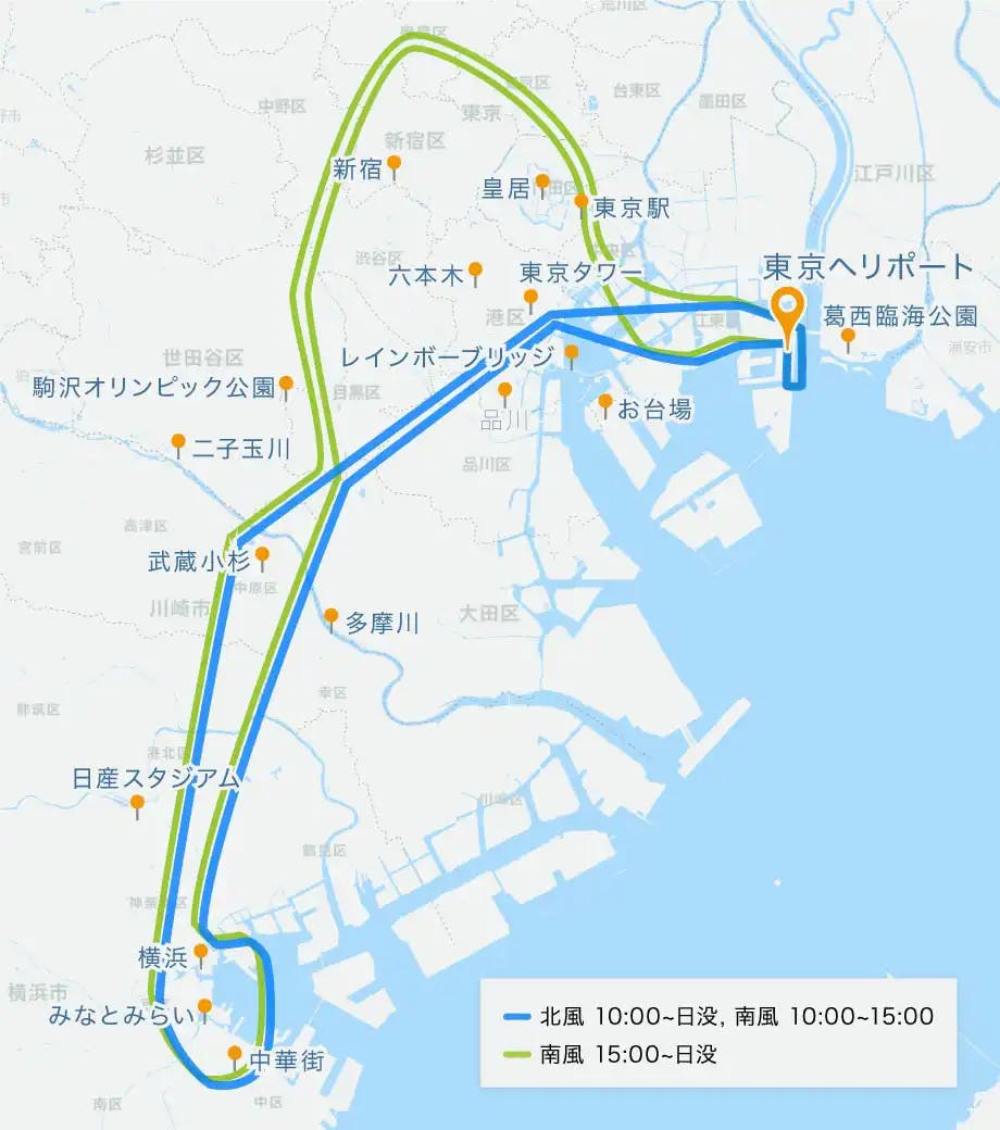 東京湾岸部と横浜の2エリアを楽しめるヘリコプタークルージングプランです。お台場やレインボーブリッジを経て、品川・五反田のオフィス街上空を経由、横浜方面へ移動します。40分間の贅沢なフライトをお楽しみに。