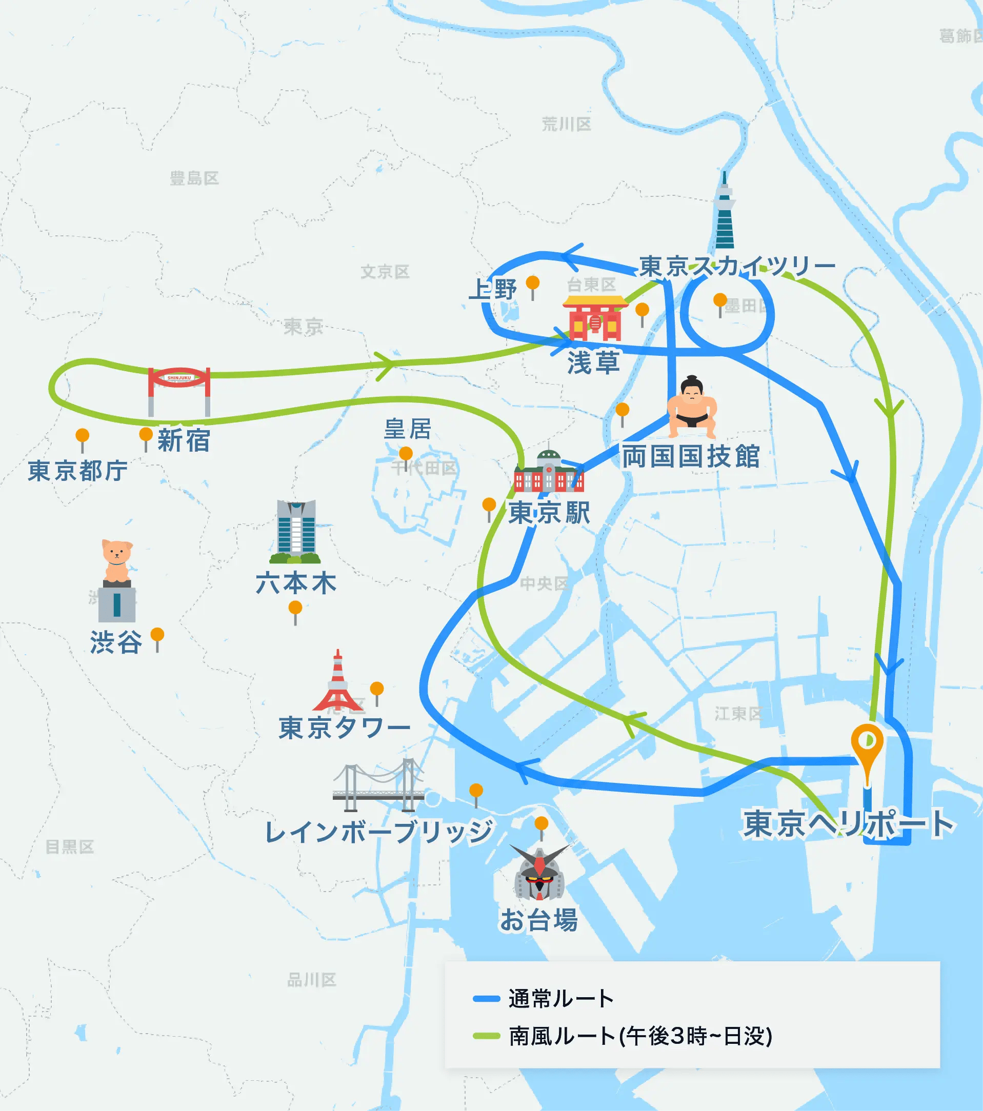 レインボーブリッジ, 勝鬨橋, 東京タワー, 東京駅, 両国国技館, 浅草寺, 上野(不忍池), 東京ドーム, スカイツリー