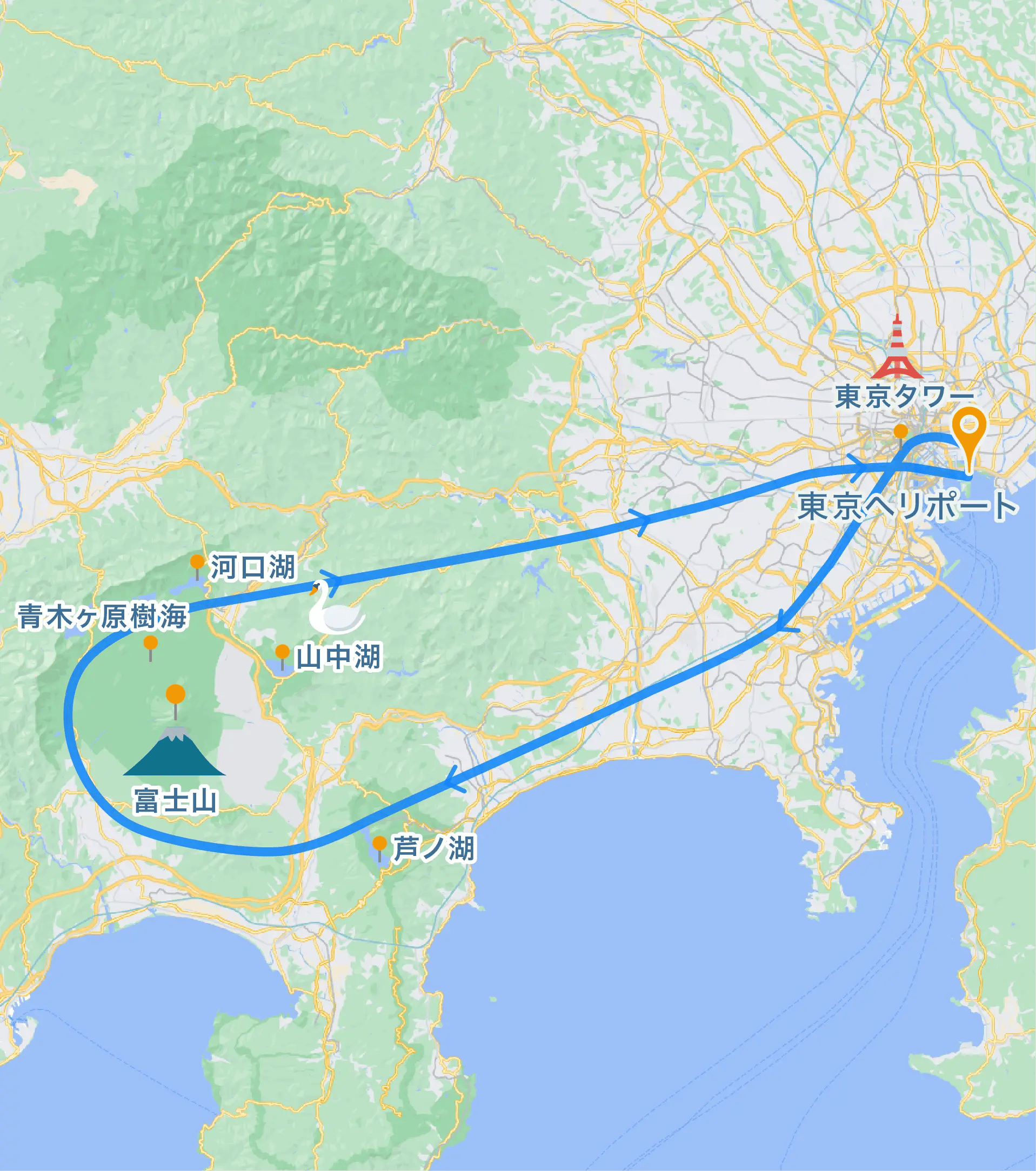 東京から出発し富士山を旋回する超豪華プランです。お台場、みなとみらい、江ノ島など東海道沿岸部をフライトし、箱根、芦ノ湖上空を遊覧、雄大な富士山をぐるっと1周し樹海・富士五湖を堪能します。ロングフライトには、広くて快適な5人乗りヘリがおすすめ!
