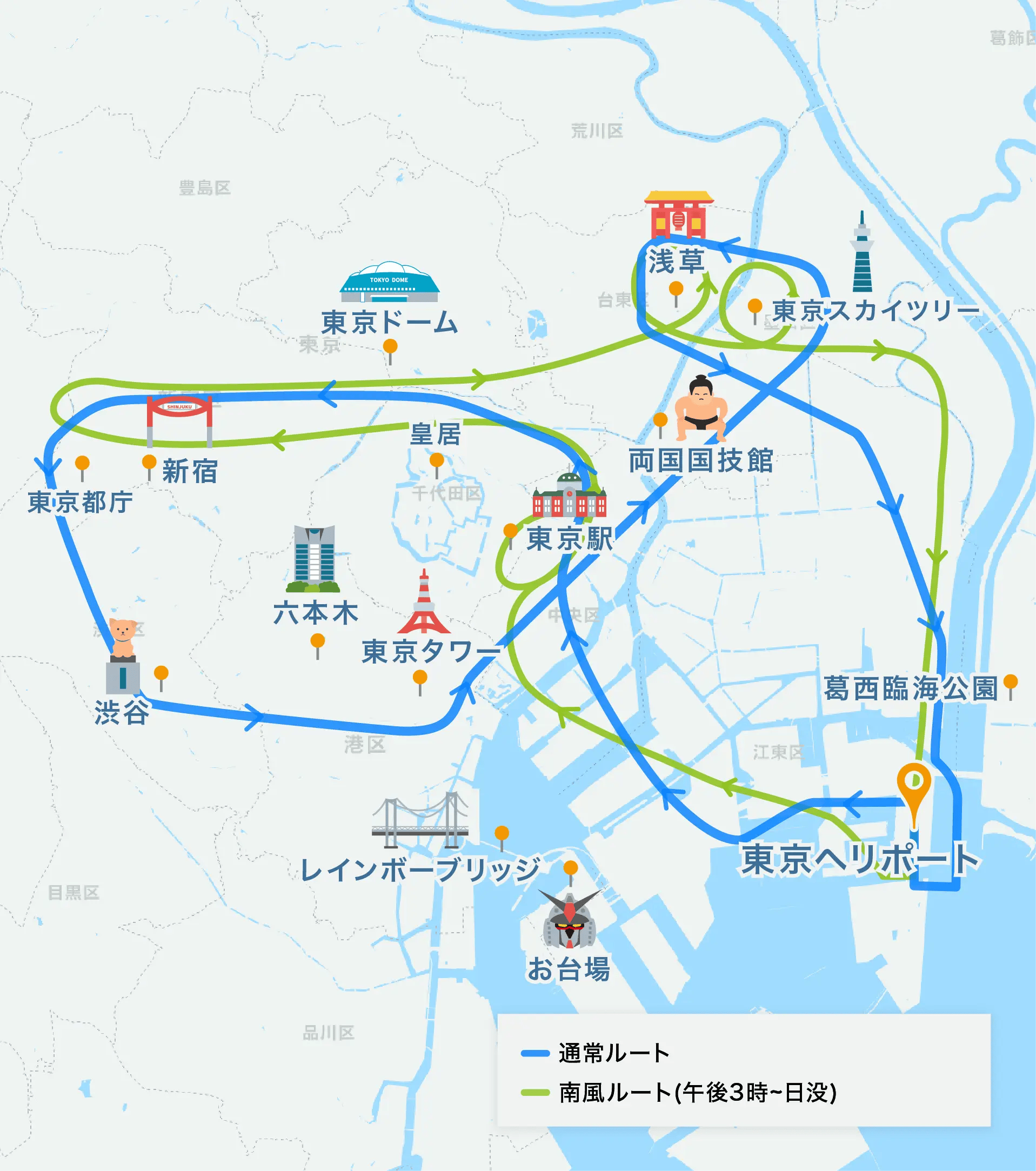 羽田空港の新飛行経路の運用開始に伴い、フライト当日の風向きにより遊覧コースが異なります。