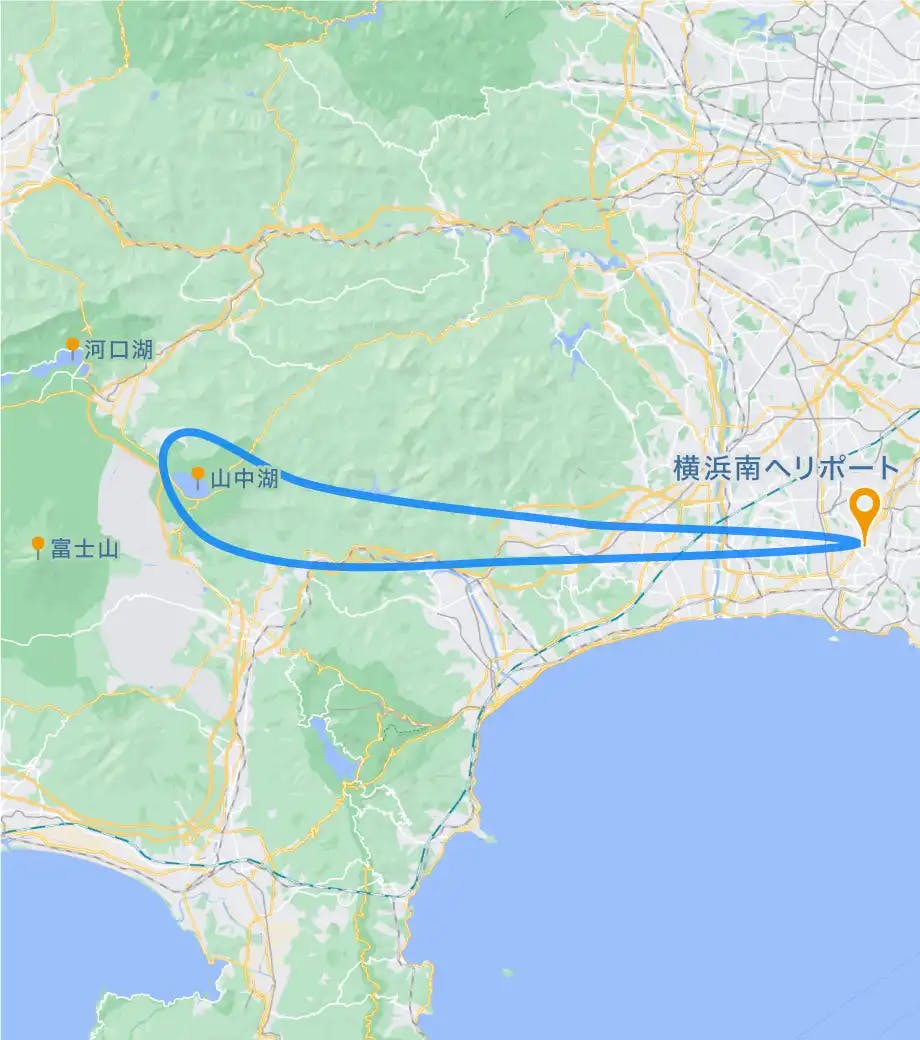 横浜南ヘリポートから富士山方面へヘリコプターでフライトし、山中湖でまでフライトするプランです。ヘリポートを離陸しまっすぐ富士山へフライトします。富士山はもちろん、山中湖などをお楽しみいただきます。