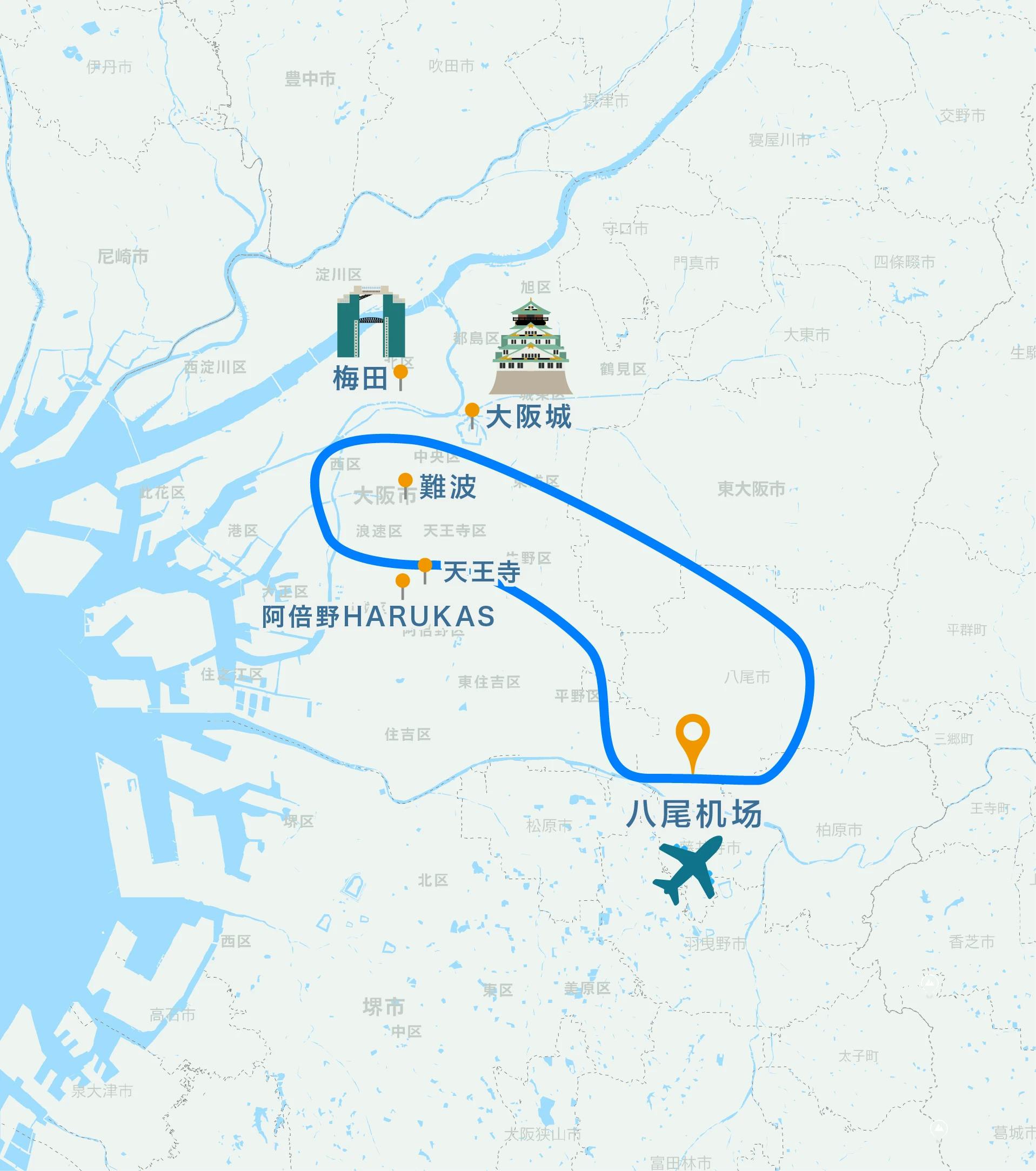 天王寺, 难波, 大阪城, 梅田, 阿倍野遥, 姚机场